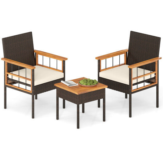 3 Piece Patio Conversation Set with Solid Acacia Wood Armrests and Tabletop-White – Color: White