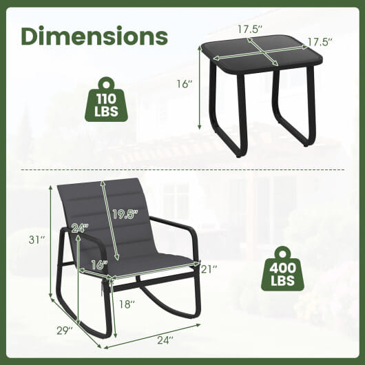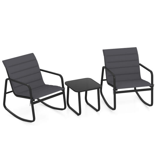 3 Piece Outdoor Rocking Bistro Set Porch Rocker Chairs with Tempered Glass Table-Gray – Color: Gray