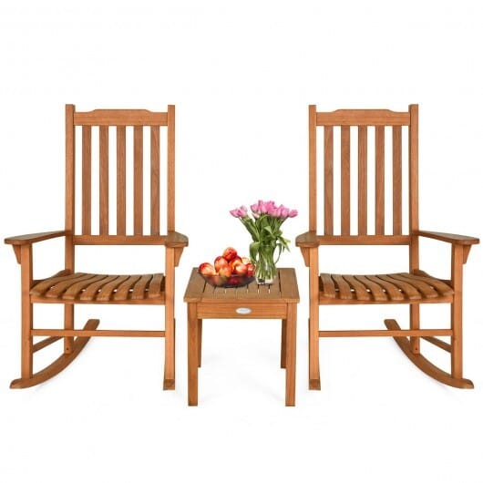 This eucalyptus rocking chair set is perfect for the patio backyard porch garden or beach area.