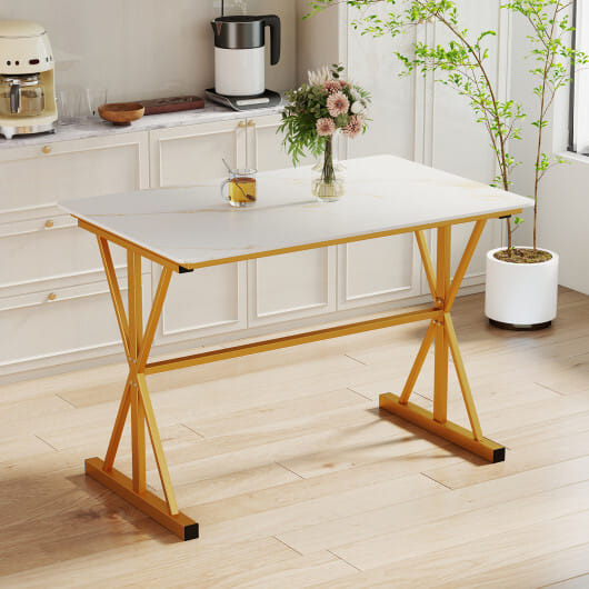 ● Features a golden frame and a faux marble tabletop elegant and stylish