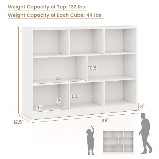 There are 8 cubes in total to store and display daily supplies in different sections which can well suit your storage needs. What’s more the wide cabinet top is a perfect platform to display some decorative items. Crafted of durable engineered wood and MDF this bookshelf is sturdy and reliable for long-term use. With simple and modern design this 3-tier bookshelf adds highlight to living room kid’s room bedroom and study. It is a practical storage solution to organize your clutter whether used as a bookcase and display shelving.