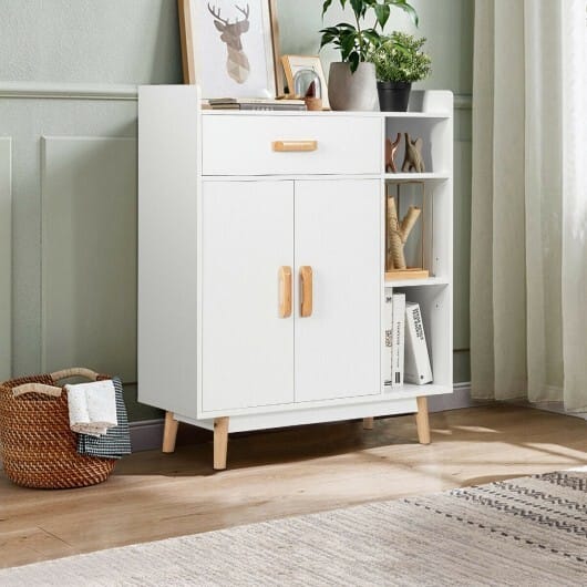 This cabinet is made of high-quality materials and supported by rubberwood legs which could last for years of use. The large drawer provides private storage space for socks underwear or jewelry and the double-door cabinet with an adjustable shelf is suitable for storing books documents etc. In addition you can display crafts on three open shelves. With a stylish appearance the storage organizer can add a unique charm to your living room bedroom porch and various places.