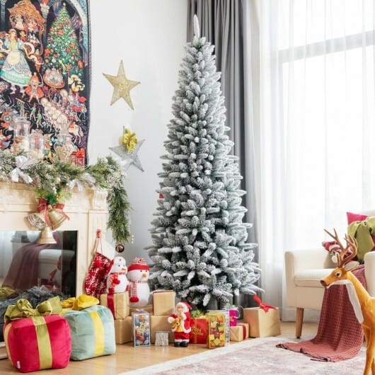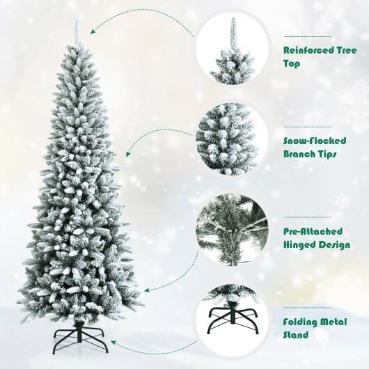This snow-flocked Christmas tree is such a perfect decoration. Flourishing leaves with snow-flocked design create lush artificial tree in slim shape. And the different shapes of leaves reflect layered and lifelike appearance. Unfold the stand install the hinged sections one by one and fluff the branches carefully how simple the assembly it is. Meanwhile hinged sections and folding metal stand make it convenient to disassemble the tree for space-saving storage. Also the enhance metal stand offer a firm support to this upright tree.